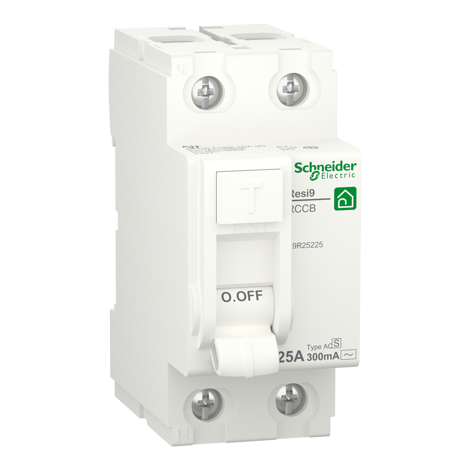 This is a Resi9 RCCB residual current circuit breaker (RCCB). It is a 2P circuit breaker with In rated current of 25A, AC-S type protection class and a 300mA earth leakage sensitivity. This product protects against electrical shock by direct or indirect contact and fire hazards. As an high sensitivity residual current circuit breaker, it is recommended for all power sockets. It is also compulsory for all equipment in bathrooms, outdoors. The Resi9 is targeted to the residential market for individual and collective buildings. This product is compliant with EN/IEC 61008-2-1 standard. The (Inc/IΔc) conditional rated short circuit current is 4500 A. The (Im/IΔm) rated making and breaking capacity is 500A. The electrical endurance is up to 10000 cycles. The mechanical endurance is up to 20000 cycles. The Ue operational voltage is 230VAC. It is DIN rail mountable. The width in 9mm pitches is 4. The product colour is white (RAL9003). The dimensions are (W) 36mm x (H) 81mm x (D) 73mm. It has an IP20 degree of protection. It becomes IP40 once in modular enclosure according to IEC/EN 60529 standard. The operating temperature is from -5°C to 40°C. The storage temperature is from -40°C to 80°C.